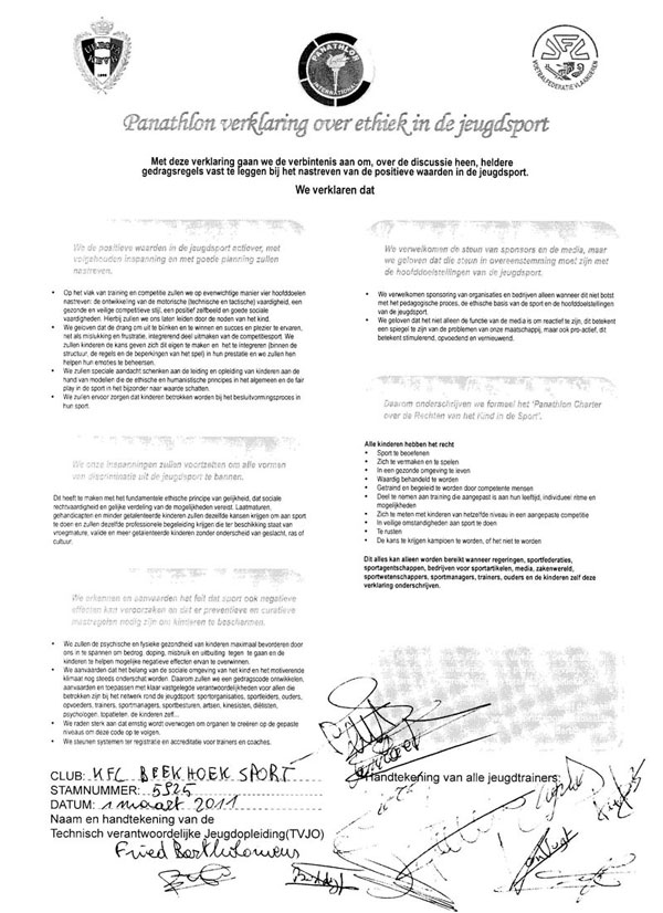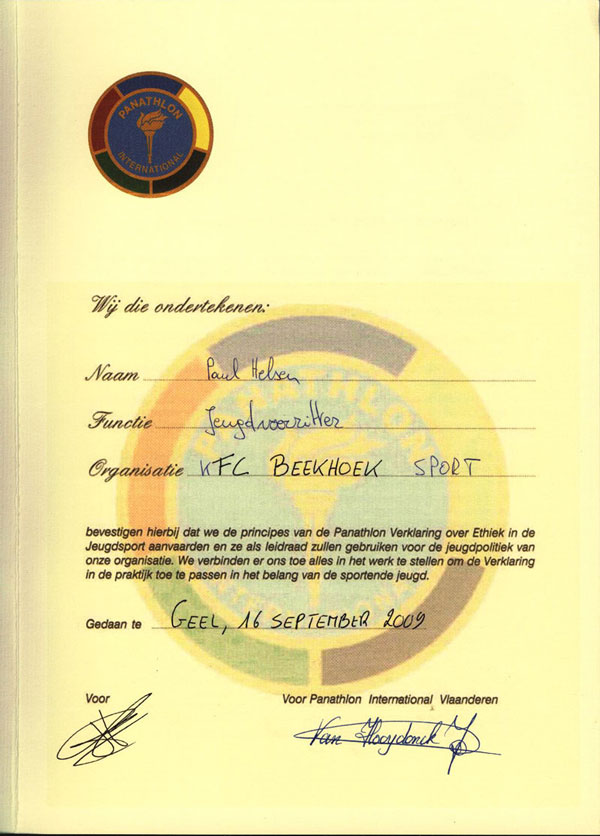 Het Panathlon Charter is voor ons geen formaliteit, maar een belofte. Een belofte aan onze spelers, hun ouders, onze trainers en vrijwilligers dat KFC Beekhoek een plek is waar elk kind zichzelf mag zijn, fouten mag maken en vooral met plezier mag sporten.